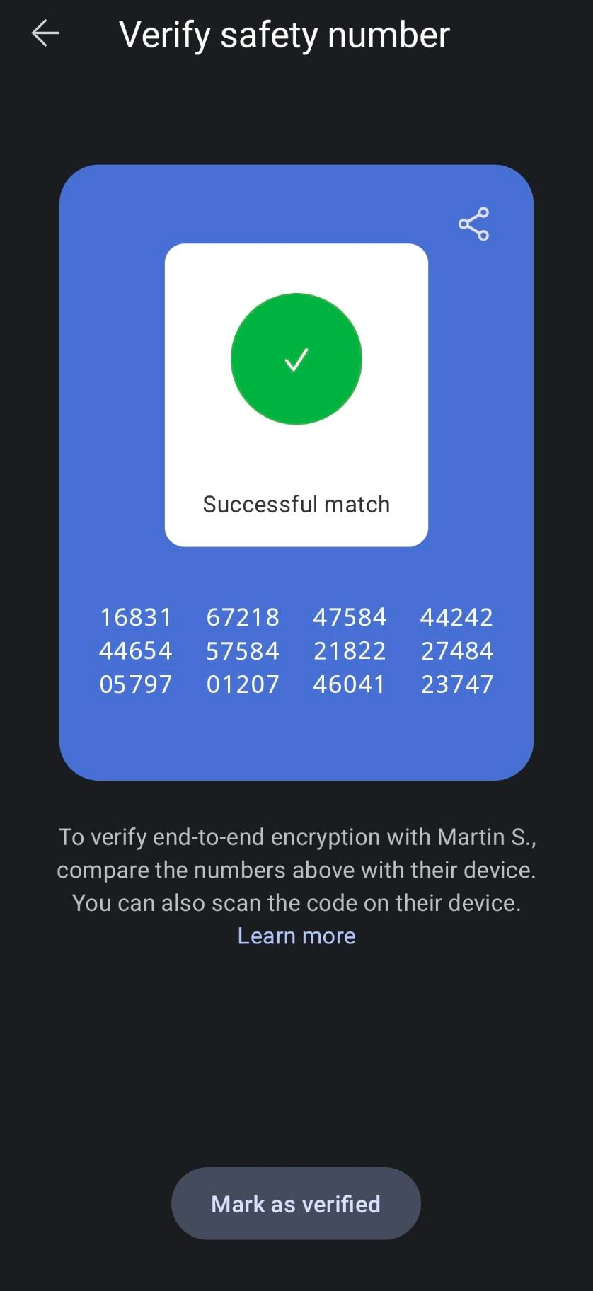 If you both see the same numbers, your session is secure — go ahead and mark each other as “verified.” If the numbers don’t match, you shouldn’t talk over this channel.