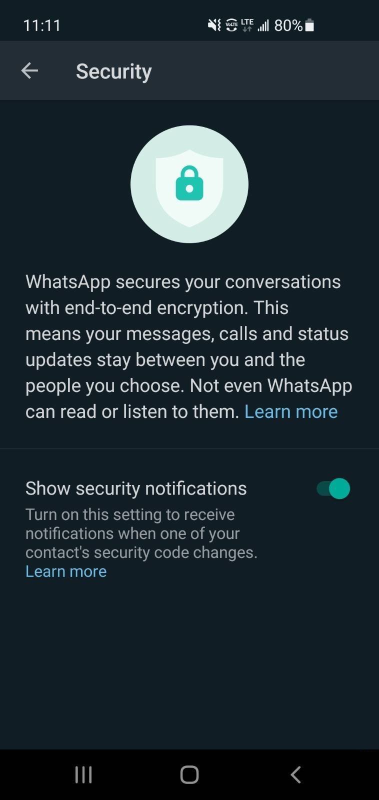 By default, WhatsApp does not tell you whether your conversational partner’s encryption keys changed. What does this mean? If the encryption key for a conversation changes, it could mean that your partner got a new phone or reinstalled the app, effectively changing how your messages will be encrypted to them moving forward. For more high-risk users, including journalists, it could also mean that someone is deliberately messing with your encryption. You can have WhatsApp notify you when a key changes in your conversation: