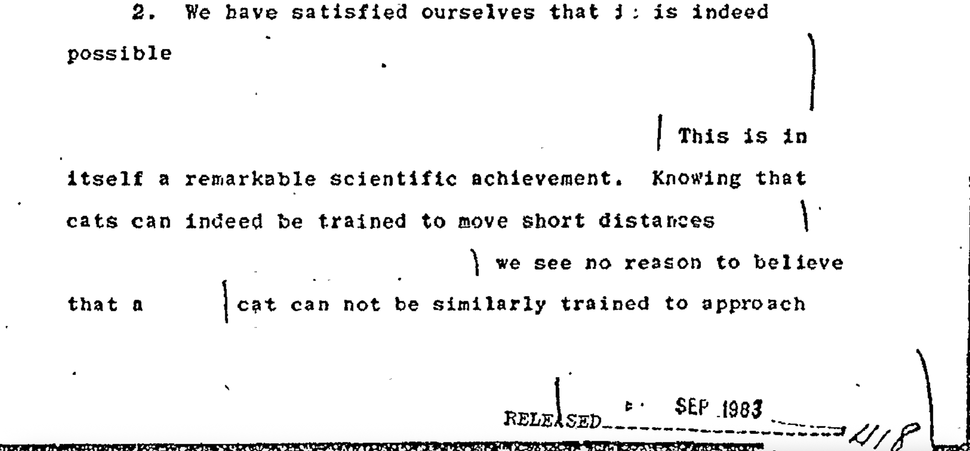 P.S. In October, we’re looking back at some of the eeriest government documents that have been released, largely thanks to FOIA. This week, we’re bringing you the Acoustic Kitty files — the CIA’s attempt to create cyborg spy cats by putting batteries in their guts, using their tails as antennae, and training them in espionage. It didn’t go well, but you wouldn’t get that from the CIA’s trained cats memo.